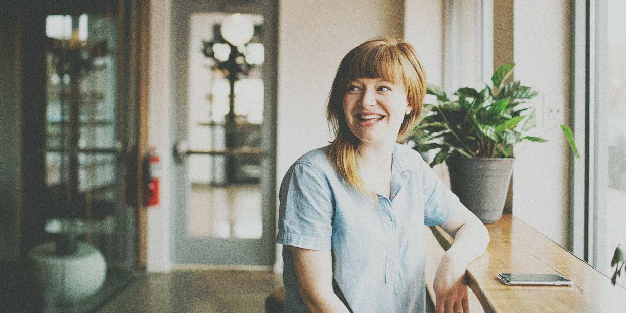 Woman in light blue shirt sitting at a table against a window