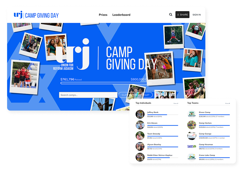 Union for Reform Judaism (URJ)’s annual Camp Giving Day is a peer-to-peer fundraising competition across URJ’s 14 camps. After experiencing challenges with a previous platform that was great for gamification but had gift processing limitations, URJ decided to use GoFundMe Pro’s peer-to-peer fundraising technology for its second annual Camp Giving Day. GoFundMe Pro provided the reliable infrastructure needed for a large-scale, multi-entity fundraising competition, ensuring seamless and dependable gift processing.
