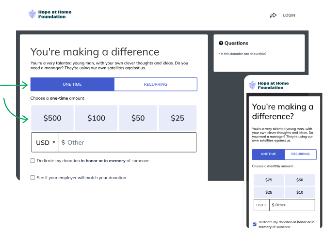 Based on previous test learnings, we think restyling the donation frequency toggle will clarify default selections, while streamlining ask amount options will attract more visitors to the custom amount field and increase gift size consideration. Together, these optimizations will boost revenue and recurring conversions.