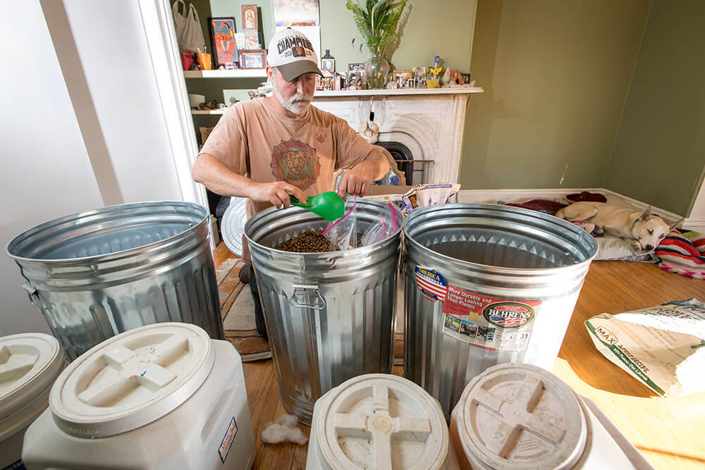 Paul hands out 30–40 bags a week-each filled with 10 cups of kibble, a can of food, and several treats. He estimates that each bag costs $10.