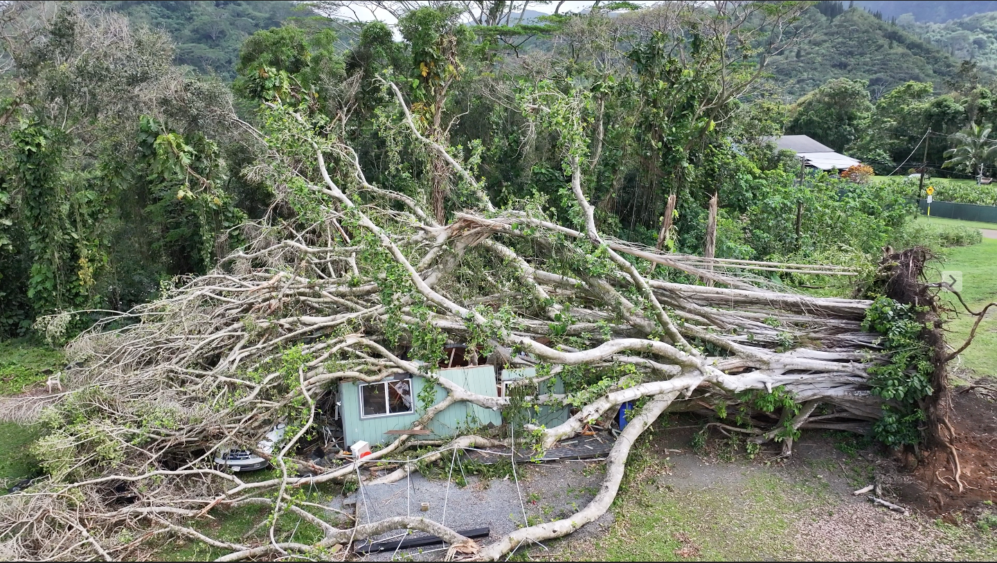 On March 14, 2026, during a powerful Kona Low storm, tragedy struck. A massive banyan tree—estimated at 150 feet tall with a root ball nearly 25 feet in circumference—fell onto Larry’s home, destroying it, his car and a friends truck. As a strong Kona gust swept through the valley, a neighbor watched in horror as the tree came crashing down.